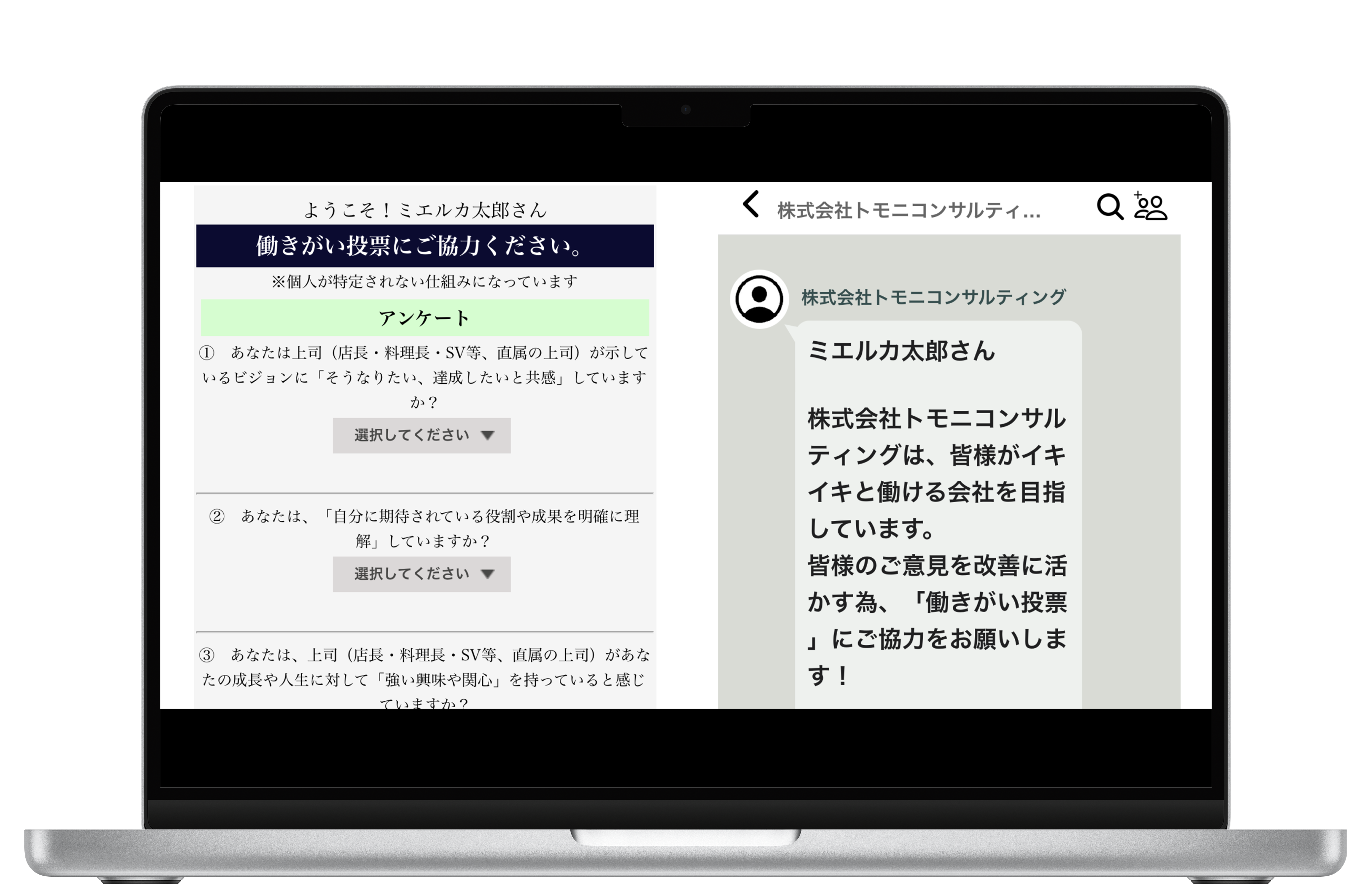 働きがい・エンゲージメントを測定。匿名回答も選択でき、改善アクションにつなげやすいレポートを提供します。
