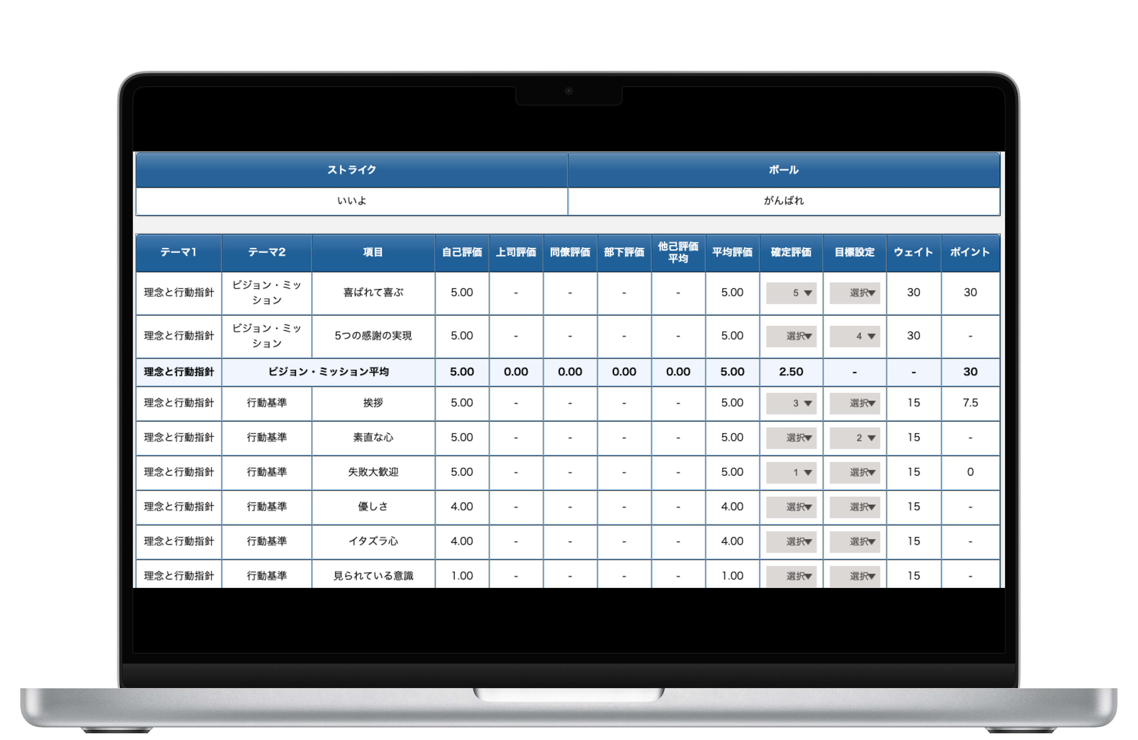 評価テンプレと360度評価に対応。カスタムKPIとも連動でき、評価結果を権限に応じて閲覧・集計できます。