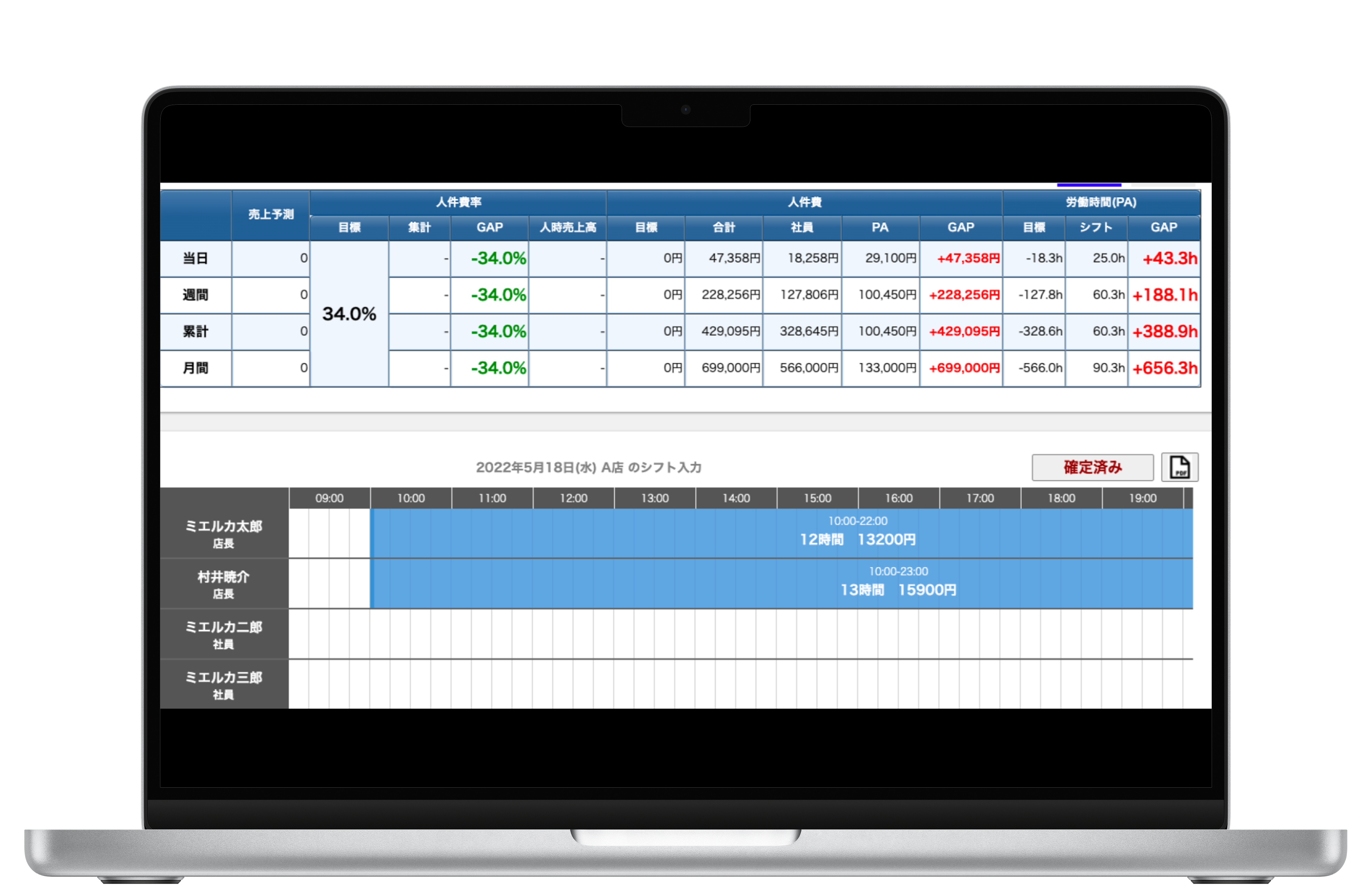 売上目標や実績と連動したシフト作成。単一店舗編集+複数店舗同時承認に対応し、希望シフトはアプリから提出できます。